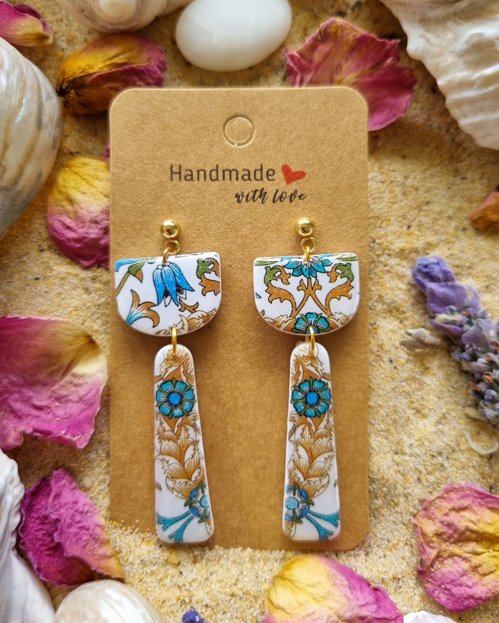 Eastern Bloom earrings. Handcrafted from polymer clay, they feature delicate floral motifs in shades of turquoise and gold blooms entwined with soft ivory tones, capturing the calm elegance of an ancient garden. Lightweight yet striking, these earrings bring a graceful, oriental touch to any outfit.